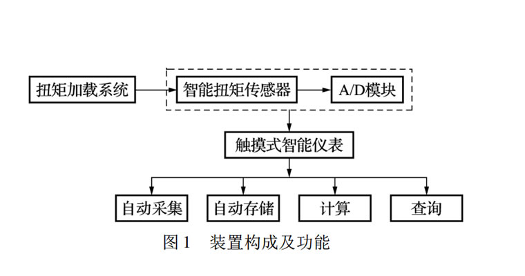 整個智能型便攜式電動扭矩扳手校準裝置由扭矩加載系統(tǒng)、智能傳感器和智能儀表等構(gòu)成, 如圖 1所示。自動和手動相結(jié)合的加載方式提高了工作效率,也節(jié)省了人力。智能傳感器采用低成本的 DALLAS2401 半導(dǎo)體芯片, 降低了生產(chǎn)成本, 可實現(xiàn)自動識別功能。觸摸式智能儀表能實現(xiàn)峰值自動采集、存儲計算和查詢功能,可在現(xiàn)場完全取代計算機。