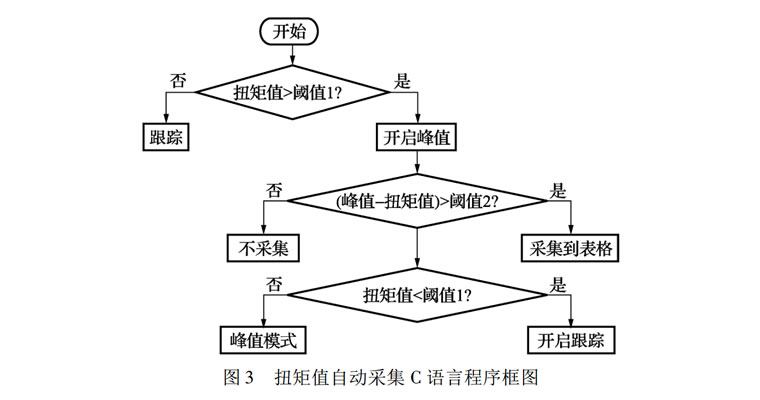 大多數(shù)儀表只具有顯示功能不具有數(shù)據(jù)采集和分析功能,校準人員在校準時,一邊操作校準裝置,一邊用筆記錄校準數(shù)據(jù)。這樣不但工作效率低還容易出錯。為了方便校準員做記錄,儀表專門設(shè)計了數(shù)據(jù)采集功能,采集表格形式完全按照 JGJ707—2014《扭矩扳子檢定規(guī)程》的表格形式[7,這樣方便后面的計算和出證書。儀表采用具有C語言功能的觸摸屏作為顯示終端。校準人員可以通過設(shè)定最大扭矩值和采集觸發(fā)值, 實現(xiàn)扭矩值的自動采集。并根據(jù)采集數(shù)據(jù)進行平均值和示值相對誤差和示值重復(fù)性的計算。C 語言程[8]框圖如圖3 所示。其中閾值1表示進入峰值模式的判斷條件,閾值2表示采集峰值判斷條件。當扭矩值超過閾值 1,儀表自動從跟蹤模式變?yōu)榉逯的J。當峰值和當前的扭矩值之差大于閾?2 時,程序會將峰值自動采集到表格中,然后解除峰值功能。閾值1和2的設(shè)定根據(jù)智能傳感器的量程來計算得到。本設(shè)備中閾值1為傳感器滿量程值的5%,閾值2為滿量程值的2/3。