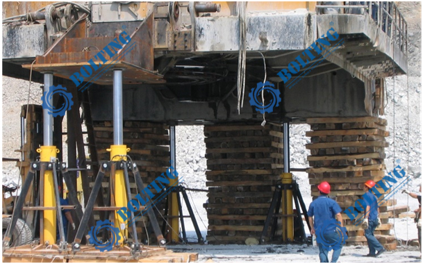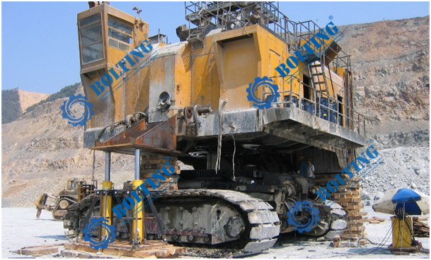 已知所需頂升設(shè)備為礦用電鏟,對電鏟進(jìn)行回轉(zhuǎn)支承維護(hù)等工作,總重量約為1000噸,需更換履帶行走裝置、回轉(zhuǎn)裝置等部件,就需要將整機(jī)同步頂升,平穩(wěn)的頂起到一定的高度,便于現(xiàn)場的檢修,頂升過程中需保證不損壞整機(jī)結(jié)構(gòu),也需使其均衡受力。