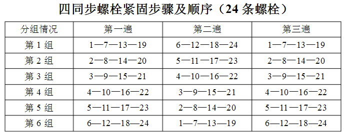 7、從1#螺栓按順時針方向,采用兩同步和四同步采用對邊緊固的原則,說明螺栓的緊固順序。單緊按兩同步的順序進行。