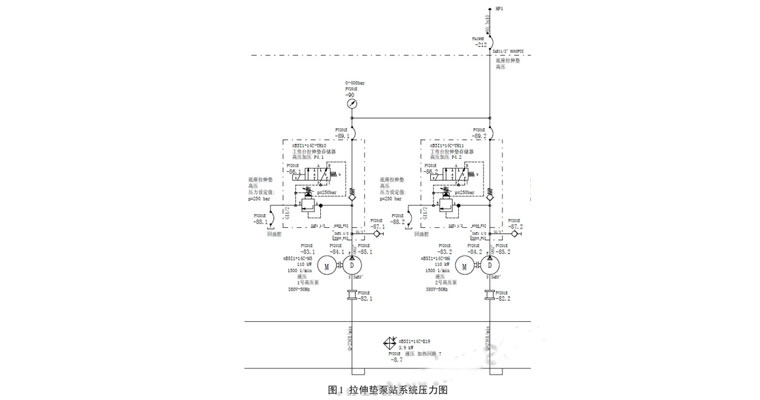 拉伸墊泵站由控制油泵、高壓油泵、低壓油泵、循環(huán)冷卻泵組成。實(shí)際工作中,除開其它原因?qū)е碌谋脝訔l件不滿足的情況外,系統(tǒng)壓力故障主要有兩種情況,液壓泵損壞和泵出口控制閥損壞。液壓泵或電機(jī)損壞直接導(dǎo)致系統(tǒng)無壓力,這種故障查找也非常簡單:啟動液壓泵檢查電機(jī)和泵的運(yùn)行狀態(tài),如果運(yùn)行正常,泵體和進(jìn)出油管溫度與油箱溫度接近,說明泵沒有問題;如泵不能啟動,即可排查電機(jī)控制電路的熔斷器,如熔斷器正常,即可檢查電機(jī)繞組;若出現(xiàn)液壓泵能夠啟動但超負(fù)載的現(xiàn)象,需要拆分電機(jī)和泵的連接,分別盤車,排查故障是電機(jī)還是泵的原因造成。液壓拉伸墊泵站采用先導(dǎo)式溢流閥、換向閥和單向閥的組合,實(shí)現(xiàn)系統(tǒng)供油和泵無壓循環(huán)功能,如圖 1 所示:拉伸墊動作時(shí)系統(tǒng)壓力開關(guān)監(jiān)控到壓力降低至最小工作壓力,就會給出指令到控制溢流閥的換向閥;換向閥得電斷開先導(dǎo)閥回油,溢流閥停止無壓循環(huán)開始往系統(tǒng)供油;當(dāng)系統(tǒng)壓力達(dá)到最大工作壓力后換向閥失電,系統(tǒng)開啟無壓循環(huán),單向閥阻止系統(tǒng)油液回流。由于從供油至無壓循環(huán)交替的過程中,單向閥也會隨開啟關(guān)閉動作,插裝式單向閥關(guān)閉時(shí)如果進(jìn)出口壓差過大,閥芯關(guān)閉就會沖擊閥體,可能導(dǎo)致閥體碎裂,泵出口油路與回油管直通。若拉伸墊設(shè)備在投入使用初期,可能會多次出現(xiàn)單向閥損壞使得系統(tǒng)壓力不能建立故障,這就需要調(diào)低先導(dǎo)式溢流閥的開啟壓力即可解決這個(gè)問題。而溢流閥的壓力調(diào)整可以根據(jù)壓力切換時(shí)的狀態(tài)來調(diào)整,可先將壓力調(diào)高至單向閥關(guān)閉時(shí)到出現(xiàn)嚴(yán)重撞擊閥體上限,再略微調(diào)低壓力,直到單向閥柔和關(guān)閉為止。溢流閥壓力調(diào)整太低則會導(dǎo)致系統(tǒng)達(dá)不到最高壓力而一直供油,油液一直溢流回油箱的現(xiàn)象。