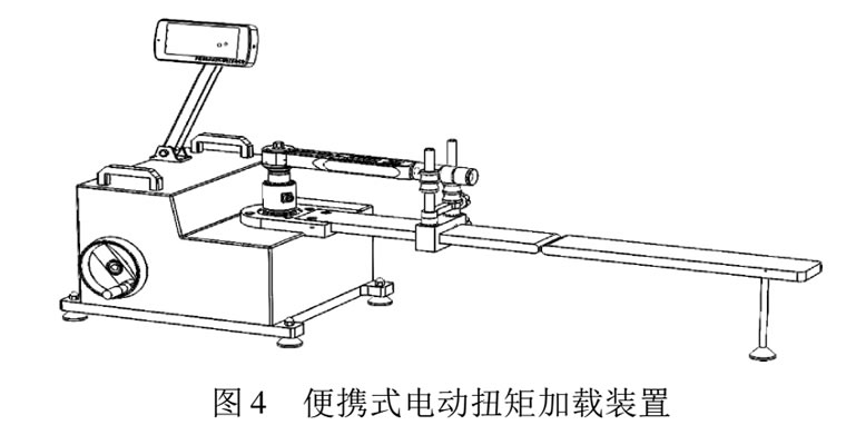 為方便現(xiàn)場檢定使用,整個設(shè)備必須方便攜帶。因此檢定裝置的支撐臂采用可折疊式,扭矩傳感器也采用直插式,現(xiàn)場不需任何工具就可以安裝和拆卸加載裝置。智能儀表采用可伸縮支架固定,方便調(diào)整角度。整個裝置的結(jié)構(gòu)示意圖如圖 4 所示。因為大部分的現(xiàn)場裝置考慮到電源的問題, 所以多是采用手動加載的方式。這樣在被檢扳手從剛裝上到加上扭矩會有一段空行程, 全部采用手動加載,一方面比較費力,另一方面工作效率也不高。因此,在加載方式上采用手動和電動相結(jié)合的方式,裝置中加一個儲能式電機來實現(xiàn)空行程的電動加載,節(jié)省人力,提高效率, 當空行程結(jié)束傳感器加上力后就可以改成手動加載。