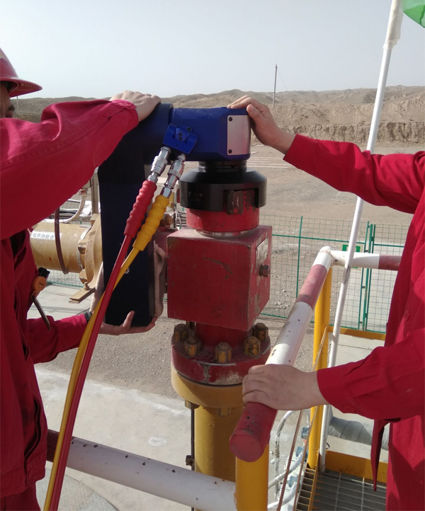 經過我們該區(qū)域的現場銷售工程師勘察測量做出解決方案,BOLTING(博霆)為之專門定制的天然氣單井固定式節(jié)流閥專用液壓扭矩扳手解決了困擾他們難題,得到了用戶的認可,施工現場如下: