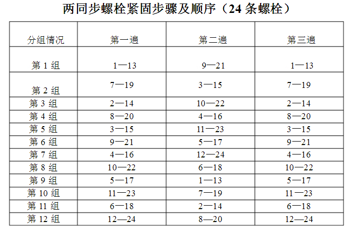 7、從1#螺栓按順時針方向,采用兩同步和四同步采用對邊緊固的原則,說明螺栓的緊固順序。單緊按兩同步的順序進行。